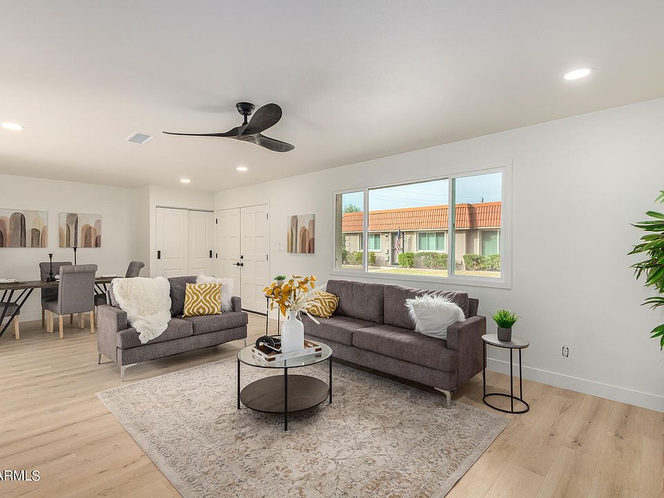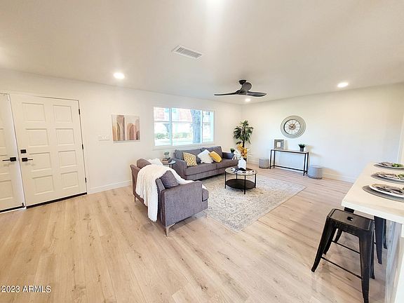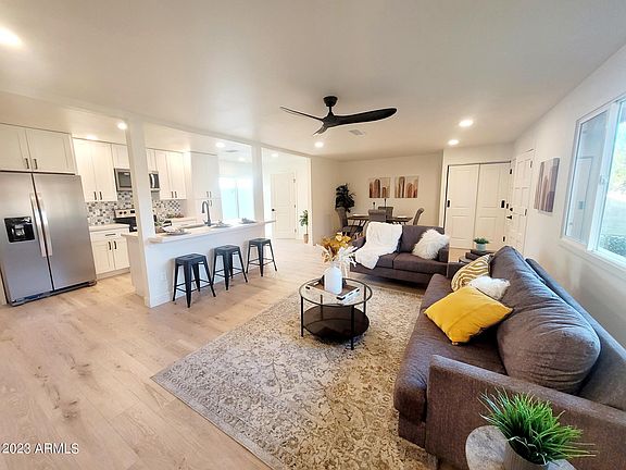 WOW what a Gorgeous Property!!! RV Parking Available!! NEW 3 TON HVAC System. This 3bed/2bath home sits on a N/S facing lot with tons of upgrades. House boasts: New Shaker Soft Close Cabinetry, Quartz Counters, Island, Stainless Steel Appliances, Custom Backsplash, Laminate Flooring, Dual Pane Windows, New Plumbing and Electrical Fixtures, Remodeled Bathrooms, New Doors/Base/Trim, Fresh Paint, Large Laundry, Greatroom, Patio, Cfans, Recessed Lights, Pantry and Much Much more. Located in the Highly Regarded Chateau De Vie Community just a stones throw from the Community Pool. Close to Shopping, Dining and Entertainment. Loop 101 nearby for quick commute anywhere in the VALLEY. This is a very hard to find Single Level Townhouse. Quiet community and DOES ALLOW SHORT TERM RENTALS!!! Do not miss out!!!! All work Completed by Licensed Contractors.