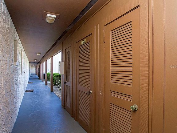 Enjoy your pet on this FIRST FLOOR ... remodeled 1 bedroom 1 bathroom condo NOT in a 55+ community. AC is 4 years new while roof is appx 2 years old. A strong secure screen door will welcome you into an all ceramic tile dwelling. Wood look ceramic tile is on the patio floor. The galley kitchen has been remodeled for more counter and cabinet space than any other unit. The kitchen has a new wall look with newly installed can lights for a brighter work space. You will enjoy a new: stainless steel refrigerator, stainless steel LG self cleaning stove, microwave, along with a newer dishwasher. A custom designed side cabinet will store larger items. White kitchen cabinets with new countertops show off new hardware also. Interior walls with floor trim have been installed and painted. Enjoy the dining room / living room combo with newly installed fan w/ light fixtures and hardware in both rooms. A new 2nd hall closet has been built to extend the hallway for more storage. The bathroom has both a shower and tub with new mirror, lights and hardware. Enjoy the screened patio with no rear neighbors and storage closet. Low HOA fees include: basic cable, television, ground maintenance, exterior maintenance, insurance, trash, water, sewer, washer and dryer along with assigned parking. Visitors have a designated area. Walking distance to Southgate Shopping Center, restaurants, grocery, shopping, beaches, bus route and more. Less than an hour to Tampa International Airport, Clearwater Beach & Florida Attractions. Your semi private beach awaits you ... BEAUTIFUL GULF HARBORS PRIVATE BEACH IS OPTIONAL $148 PER YEAR.