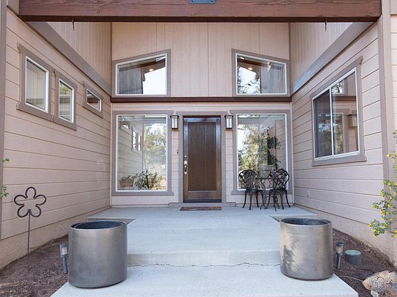 Wonderfully bright and open SINGLE LEVEL home is nestled on a heavily treed 2.57 acre cul-de-sac lot with plenty of gorgeous Ponderosa, Juniper and Oak trees. Beautiful vaulted and beam ceilings with trapezoidal windows bring in lots of natural light. In-floor radiant heating, HEATED Garage, 4 stall Behlen Barn with corrals sporting double-gate entry to deliver your hay & supplies, second detached garage, $10,000 in perimeter fencing, walk in pantry, & so much more! Horse and hiking trail to the natural forest is just one street away! Check out the virtual walk-thru tour attached herein!