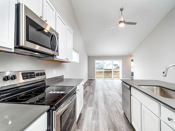 New Construction single family villa with a 2 car garage and 3 bedrooms. Open floor plan with vaulted ceiling over kitchen island, dining and living room area. Master bedroom suite with walk-in closet. White shaker-style cabinets, quartz countertops and stainless steel appliances. First floor laundry. HOA fee of $100 per month provides lawn care and snow removal services for a low-maintenance lifestyle.