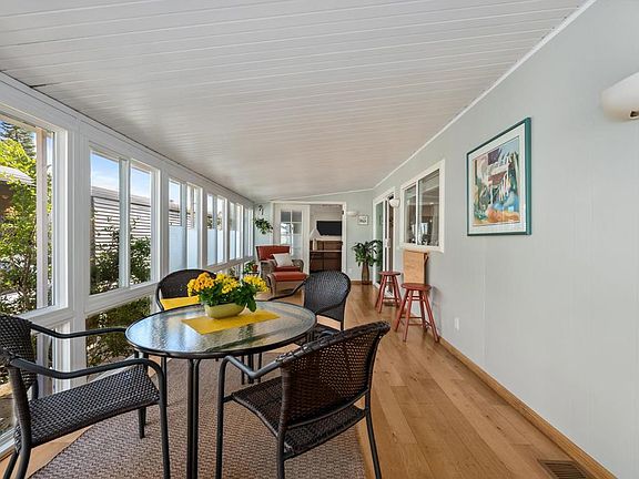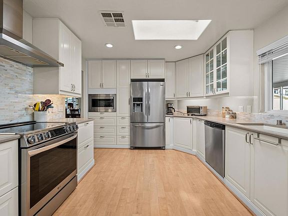 Exceptional home- in size & lot- in this premier land-owned, guard-gated 55+ community in S.D. North County. Completely remodeled in 2015, this home offers 2,000+ sq. ft. with incomparable space, comfort & style. Solar panels installed along with new roof in 2022. Vaulted ceiling in the living room with French doors, skylight & electric fireplace. Eat-in kitchen with new induction range/oven & 22 pull-out drawers (there's pantry shelving too!) sets the stage for highest-quality design & modern convenience throughout. Two bedrooms & den/office plus 3 full baths (custom counters) give you plenty of options including an en-suite guest bedroom or live-in possibilities. The large master bedroom has a walk-in closet, separate shoe shelves & ceiling fan. Built-in speakers in both bedrooms, living room & separate dining room. The primary bath is your spa. Custom jet tub, separate shower with seat, safety bars, wall & hand-held shower heads, double sinks, bidet toilet & vanity counter. Entire home has custom windows with shutters/upgraded shades, along with recessed ceiling lights with dimmers. Several additional rooms add abundant storage (with 700 sq. ft. of additional enclosed space), craft, exercise or reading room options. Wet bar with seating, sink & wine refrigerator. The attached shed has electrical, sinks & EV power access. The garden-like yard features a large paved private patio, & separate outdoor dining area with fountain. Automatic sprinkler system & motion detector lighting. Household water softener/filtration system. Serene park like surroundings with pond, creeks and numerous amenities including pool/spa, pickleball/tennis, gym, ceramics room w/ kiln, RV pkg & more. All within minutes of the beach, shopping, restaurants, medical care & more.