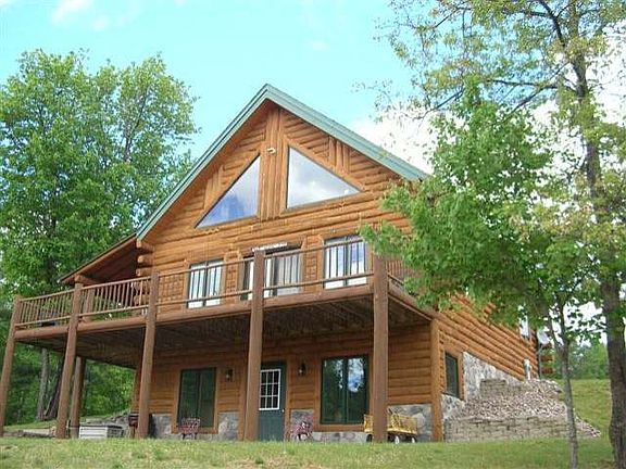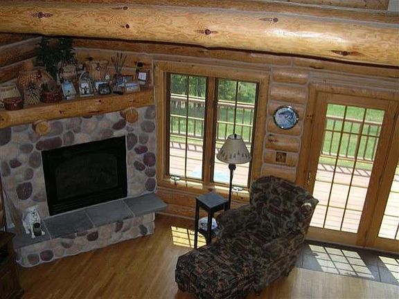This full log home is nestled on a private wooded 6-acre lot with extensive landscaping and a blacktopped driveway. The covered deck welcomes you into the great room with stone gas fireplace, log beamed cathedral ceilings with pine paneling, oak flooring, & floor to ceiling windows, and patio door to the wrap around deck. The beautiful hickory kitchen has recessed lighting, updated counter tops & breakfast area to enjoy your morning coffee. There is a main floor bedroom & large full bathroom with separate whirlpool tub & shower. The log stairway takes you to the second bedroom & full bathroom with French doors to enjoy the nature outside. The walk out lower level has a large family room, 3rd bedroom, an office/den, half bath with laundry room, & utility room. The spacious 3 car garage (28 x 32) has a stairway to the upper bonus room & would make a great art studio or man's cave. There is also a 12 x 10 storage shed for garden tools, bikes, & hunting gear.