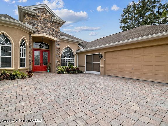 Active Under Contract – Accepting Back Up Offers Experience the luxurious elegance of this custom-built home, nestled in the sought out neighborhood of River Country Estates. This property is sure to impress, boasting 4 Bedrooms, 3 Bathrooms, and a 3 Car Garage with a long brick-paved driveway. Every detail is unique, from the lush tropical landscaping and decorative stone siding to the custom window design. Inside awaits hardwood flooring, a gas fireplace, and unique details such as tray ceilings and crown molding, adding an extra touch of class. The open floor plan between the living room/kitchen allows for easy entertaining, while the formal dining room provides additional space for gatherings. The kitchen boasts a breakfast bar, quartz countertops, and a kitchen island with custom wood cabinetry for ample storage. The master bedroom has a garden tub, his & hers walk-in closets, plus dual vanities making it your own personal oasis! Step outside through French doors overlooking the lanai and pool area, perfect for entertainment. Florida is living at its finest in your privately fenced-in yard, with endless fun activities. Enjoy your life of luxury in a home with timeless elegance. No CDD, Low HOA (annually) includes access to community park, basketball courts, tennis courts, trails, fishing pier, and lake. Minutes from Weeki Wachee Springs, Pine Island, and Buccaneer Bay. Easy access to Tampa International Airport, award-winning beaches, and luxurious shopping at International Plaza. An absolute must-see! Verify all rules at https://www.rivercountryestates.net