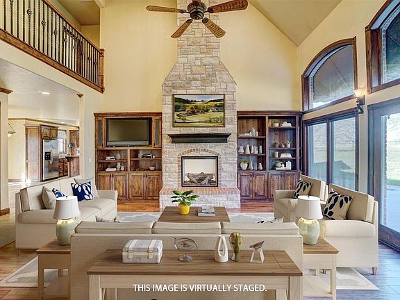 Beautiful well built home that has solid hardwood floors, travertine, custom cabinetry, high end appliances that are included, plenty of storage in the kitchen. Butler pantry has a beverage refrigerator, sink, and more cabinets. The utility room is large with a mud bench area and a sink. There is a living area off the kitchen that has a two sided gas fireplace that also is open to the living area. Both spaces have adjustable shelving with extra shelving if needed. There is a large dining area and the kitchen has a bar area for plenty of seating. The study has a closet and could be used for the 4th bedroom. It has gorgeous wood walls and shelves. Going down the hall to the primary bedroom that has a Florida room attached that also has an entrance to the living room. The walk in shower and whirlpool tub are very relaxing. There are 2 closets in the bath. One is a large walk in with built-ins. The other is a safe room which is perfect for this time of year! Upstairs are 2 bedrooms with an adjoining bath and stool area. Each bedroom has its own sink. Also each bedroom has a window seat with storage. Outdoor patio area is very nice. There is a 24x30 shop that has a full bath. On the side is RV parking and hookups with 50 amps. The front barn has electric and a auto waterer for animals. The home has a brand new roof with lightening rods! Don't miss out on this gorgeous home. Call today for an appointment. Seller offering $10k towards buyers closing costs or rate buy down.
