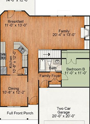 This efficient design is ideal for everyone! The open first floor includes a family-friendly kitchen, breakfast room and family room. The kitchen features stainless steel appliances, granite countertops and a diagonal tile back-splash! There is also dining room, first floor bedroom/study, full bath, and family foyer. Upstairs youll find an owner's suite that includes a separate bath and shower, and a walk-in closet. Two additional bedrooms, a full bath, a rec room and the laundry room round things out. The plan also includes 2nd floor storage space, a 2-car garage, a rear patio or covered porch, and a full front porch.