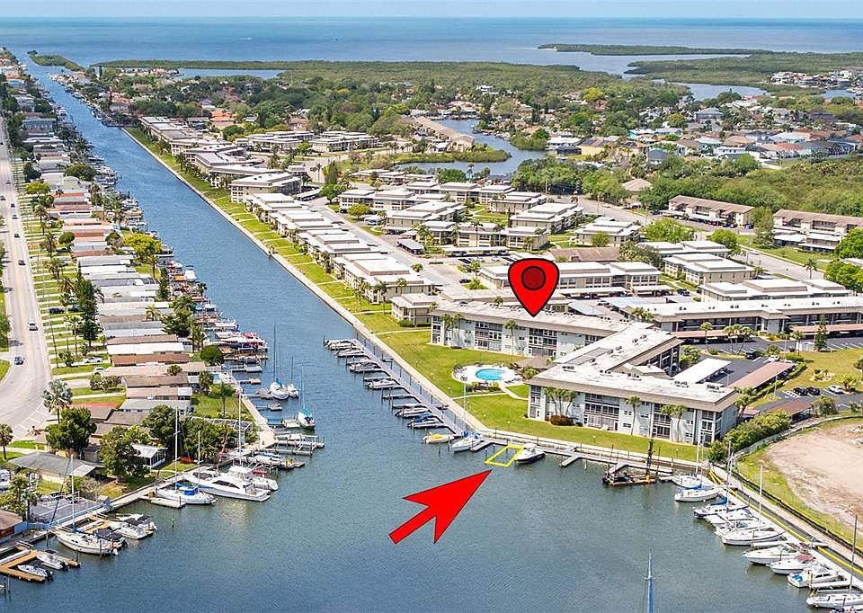 ATTN: BOATERS! DEEDED BOAT SLIP included with condo purchase! One of the deepest slips in the community! The composite, floating dock was redone in October 2023 and includes water & electric. This is truly maintenance free, waterfront living at its finest! This stunning 2-bedroom, 2-bathroom condo in the heart of New Port Richey is rarely available! This amazing condo, situated on the 3rd floor, not only has an amazing water and pool view, it is move-in ready with all the major updates done! This home has been renovated with a charming coastal themed décor and vibrant colors! It feels like you’re on vacation every day! The gourmet kitchen is a chef’s dream, with Birch custom cabinetry, plenty of storage, stainless-steel appliances (including a large double-door refrigerator), solid surface counter tops & breakfast bar. The kitchen seamlessly flows into the dining/living room combo, offering a perfect space to entertain while enjoying the picturesque water view. The main living areas of the home feature high quality porcelain wood-plank tiles…durable and beautiful! The dining area and living area feature custom built-in cabinets/shelving with lighting to lovingly display all those family photos and collectibles. The spacious living room looks right out into the Gulf! Step onto the screened-in balcony and let that cool ocean breeze take you away! The balcony is the perfect place to enjoy your morning cup of coffee and a glass of wine in the evening. This will most surely be your new favorite spot to relax and watch the manatees and dolphins! Featuring a split floor plan, the large primary bedroom, located toward the rear of the home, also featuring the fabulous water view, includes a large walk-in closet, a ceiling fan, can easily accommodate a king-sized bed and includes an en-suite bathroom. The en-suite bathroom features a tiled walk-in shower, comfort height toilet, dual sink vanity, updated lighting and vanity mirror. The secondary bedroom is also ample in size and features a custom-made Murphy Bed/Desk which matches the rooms other desk unit. This is the perfect room for guests and a home office! The updated secondary bathroom includes a charming teak vanity with waterfall sink basin, comfort height toilet, custom lighting and vanity mirror. Windward Cove Condos is a small enclave of homes with just 69 units (the roof is new in 2022). The community features a clubhouse, water/gulf front pool, tiki hut, and 2 elevators. The low monthly fee includes building exterior maintenance, insurance, sewer, water, trash, basic cable (and sports package too) and internet access. This home is conveniently located to shopping, medical facilities, and just a few minutes to downtown New Port Richey with exceptional new restaurants, the re-opened Hacienda and Sims Park! Don't miss the chance to make it yours—schedule your private showing today!