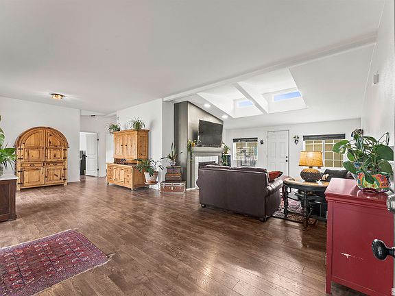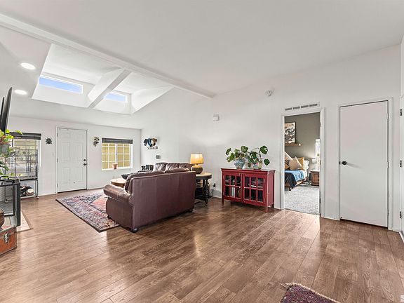 Upon entering, you’ll be greeted by a spacious living area with vaulted ceilings and skylights that flood the area with natural light. The kitchen is equipped with modern appliances and ample cabinet space complete with a breakfast nook to enjoy at your leisure. The master suite features a well-appointed en-suite bathroom with a garden tub and dual vanity sinks, while two additional bedrooms provide flexibility for family, guests, or a home office., Situated on a generous .33 acre lot, this charming residence is perfect for gardening enthusiasts and nature lovers alike. The south-facing, fully irrigated and completely fenced yard, offers a variety of fruit trees and mature grapevines and also provides direct access to hiking trails below. Two covered patios extend the living space outdoors, providing comfortable areas for relaxation and entertainment regardless of the weather.