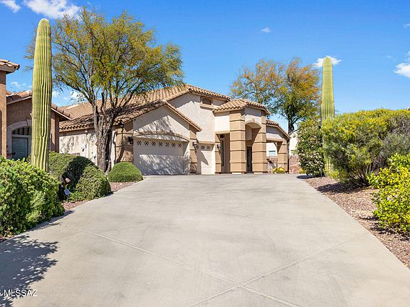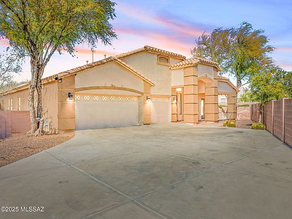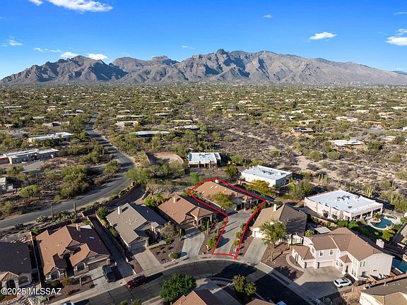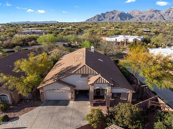 Amazing opportunity for updated 2,735 SqFt 4 bed/2.5 bath move in ready 2003 modern contemporary home with attached 3 car 698 SqFt finished post tension garage, on elevated premium .21 acre R3 corner lot in the desirable gated community of River View Estates in North Tucson. N/S orientation providing sweeping Catalina Mountain views, expansive concrete driveway, concrete sidewalks, on and off street parking, concrete tile roof, custom wall mural art and covered front patio.Step through the 10 Ft door to soaring cathedral textured ceilings (no popcorn), the house boasts energy efficient double pane windows throughout, plantation shutters, diagonal tile and luxury plank flooring throughout (no carpet), recessed lighting, modern light fixtures and hardware, zoned gas HVAC, Honeywell whole house fresh air intake filter system, 2X Nest smart digital thermostats, Ring security camera door bell, wired for alarm, 5 skylights, plumbed for water softener, Cat 5 wired high speed internet, spacious living room awash in fantastic natural light, Catalina Mountain views centered around stacked granite modern gas fireplace, separate family/formal dining, internal laundry/mud room with full slab granite counter, sink, storage and recent Samsung silver washer & dryer included. Open concept, updated kitchen is an entertainer's dream with gorgeous full slab granite countertops, full slab granite island with bar seating, honey colored modern shaker kitchen cabinets, lower cabinet sliding pull-outs, 5 burner gas stove, stainless steel exhaust hood, custom metallic backsplash, finger printless stainless steel fridge with ice/water dispenser, stainless steal appliance package, ink black undermount double sink under garden window, closet pantry, built in full slab workstation, space for dining area, adjacent to spacious living room. Three large guest bedrooms with modern sliding barn door closets, updated full guest bathroom featuring executive height dual sink full slab granite countertop modern vanity, glass walk-in tiled shower. Massive primary suite with door to private backyard features remodeled ensuite full bathroom with executive height dual sink full slab quartz countertop modern vanity, updated deluxe soaking tub, glass walk-in tiled shower, separate patio door and cavernous walk in closet. The attached 3 car 698 Sqft finished post tension garage features epoxy flooring, tall built-in storage cabinets and convenient door out to side yard. Enjoy tranquil Tucson nights under North facing covered backyard patio, and relax in the jetted in-ground hot tub. The landscaped backyard includes flagstone walking path, always green artificial grass, raised flower gardens, custom mural wall art work, fresh fruit producing lemon, cumquat and grapefruit trees, and view fencing with omnipresent Catalina mountain views. Convenient Tucson Foothills location minutes from St. Phillps Plaza, shopping, fine dining restaurants, Rillito Race Park, Chuck Huckelberry Loop (a 131-mile network of paved shared-use paths), Tucson Mall, Trader Joes and so much more! Call to make your appointment to view this turnkey home today!