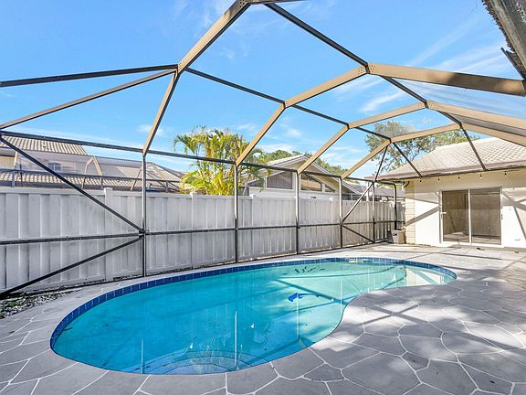 Fantastic 3 bedroom, 3 full bath and a half bath, one car garage town home. This one is rare with a private, screened in pool! This amazing home offers a split floor plan and double primary bedrooms with one on the ground floor. Features include a brand new kitchen with shaker cabinets, quartz countertops and stainless steel appliances. Updated first floor en-suite bedroom/bathroom. Vaulted ceilings make this home bright and spacious. Freshly painted and ready to move in to. Low HOA fees include building insurance, cable and internet and roof maintenance. Community pool and tennis. Great Palm Beach Gardens location!