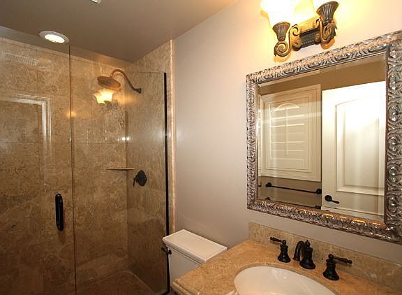 - RoomBathroomFeatures: Shower in Tub, Bathtub, Shower, Double Sinks In Master Bath, Remodeled, Upgraded, Walk-in shower, Double sinks in bath(s), Stone Counters, Closet in bathroom, Privacy toilet door