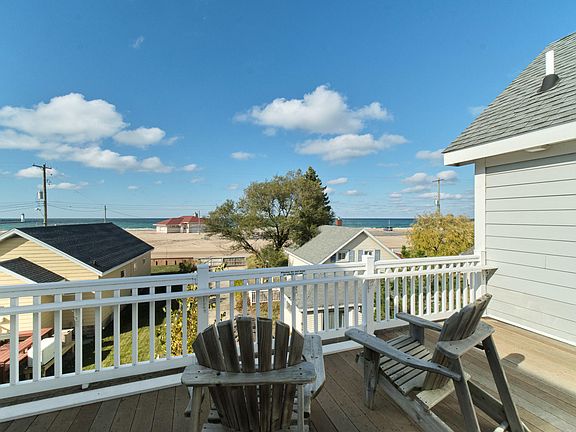 2 Houses in one with Lake Michigan steps away. With miles of sandy beaches and the North pier at your doorstep, enjoy beach days/ walks and amazing sunsets. Each cottage has 3 bedrooms, 3.5 baths, open kitchens w/hickory cabinets, stainless appliances, vaulted ceilings, central air, gas fireplaces, and main floor laundry. French doors into the master. Both cottages feature lots of windows for natural light. Connected upper deck and private decks for grilling and family gatherings. Have you and your siblings been looking for a place to share? This is perfect for you. This is a very unique neighborhood with less than a dozen houses across from the beach. Both cottages are being sold fully furnished and turn-key with vacation rental bookings. Price is based on comparison not income approach.