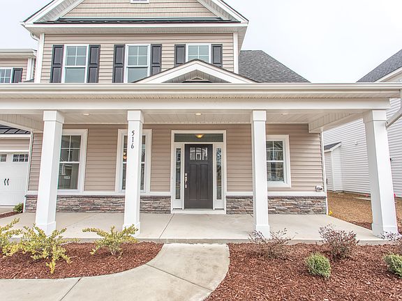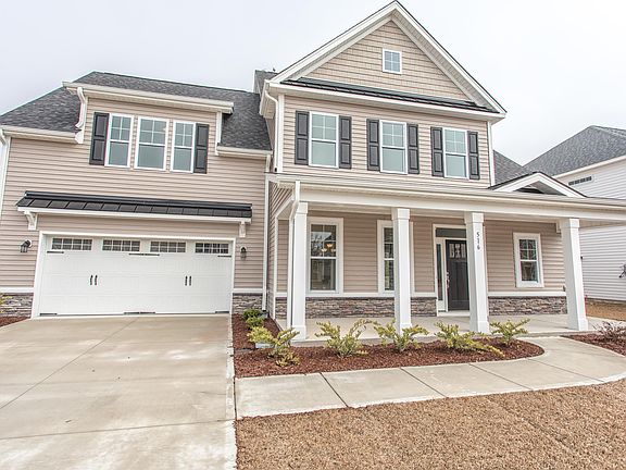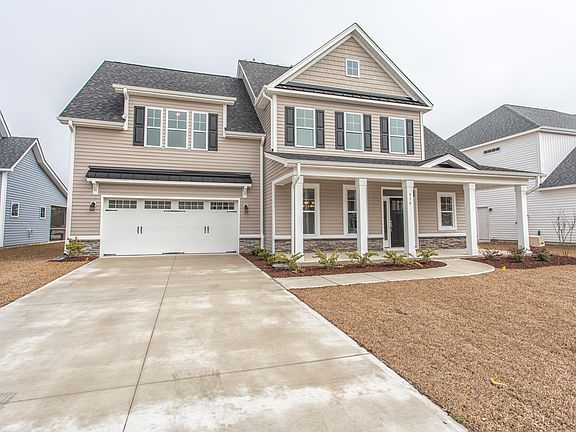The Topsail is a beautiful home with a well - designed open floor plan, 4 generous bedrooms, and 3.5 baths. The large living room is highlighted by a coffered ceiling, large telescoping sliding doors leading to covered porch, and gas FP and open to the stunning kitchen boasting a large center island with seating, granite counters, SS appliances, frosted glass pantry and breakfast room w/wainscoating. The formal DR has trey ceiling and wainscoting, foyer, powder room, large mudroom with built-in cubbies, and storage room all complete the 1st floor. All Bedrooms are upstairs with tranquil master suite offering trey ceiling, his/her walk-in closet, tiled shower, dual vanity & large linen closet.