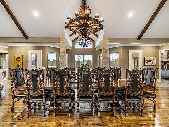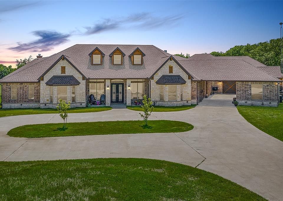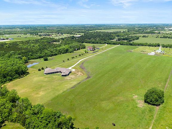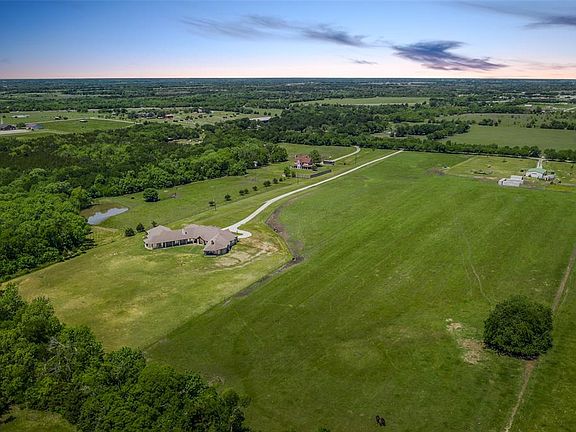Luxury & country style living mins from metroplex, over 7000 sq ft on 1 floor & 4-car garage. Enjoy views on 24 acres of fenced & cross-fenced acreage. Gourmet kitchen with exotic granite tops SS appliances & 3 copper sinks with 2 disposals. Open floor plan to the oversized family room. Extensive wood & brick flooring throughout the house. MB has private patio, huge bathroom with oversized walk-in shower, 2 WI closets, separate vanities, 12 jet tub and flex room. Bonus items: 4 fireplaces, game room, office with built-ins & each wing has its own laundry room. Separate wings for master suite & 3 en-suite bedrooms, 2500 sq ft shop
