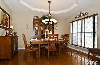Gorgeous 4 Bd/3 Bth Atrium Ranch in the Heart of Eureka. This meticulously maintained, 5 yr old home boasts an open flr plan w/ 9? ceilings & over 2600 sqft of living space including professionally finished lower level. Foyer w/ wood flrs opens to fantastic coffered Dining Rm, & spacious Great Rm w/ gas fireplace. Gourmet Kitchen features custom cabinetry, 42? wall cabinets, granite tops, stainless appliances & hardwood flrs. Adjoining Breakfast Rm has hardwood flrs & sliding glass door to deck. Mstr Bdrm Ste (located on opposite side of house from guest bedrooms) features luxury Mstr Bth w/ soaking tub, separate shower, dbl vanity w/ knee space & huge walk-in closet. Main flr also includes Office w/ dbl doors, 2 addtnl bdrms, full bath & convenient Laundry/Mudrm. Walkout lower level has spacious Rec Rm, bdrm & full bth. Relax outside on the deck or patio & enjoy the picturesque views. Convenient to shops, restaurants & highways.