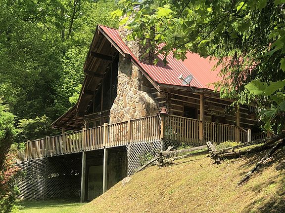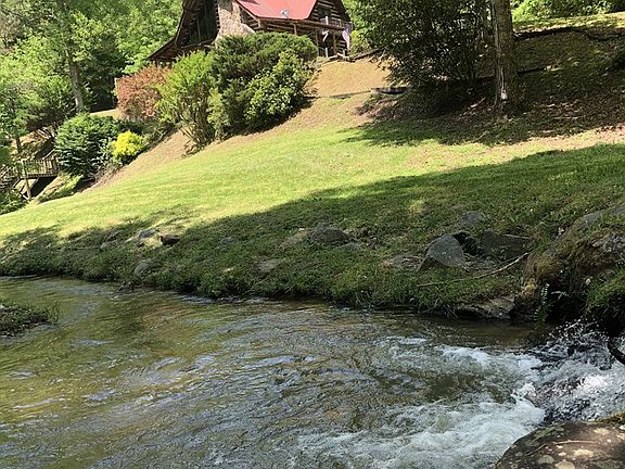 30+ acres of rolling hills in the Mountains of North Carolina. Secluded private driveway curves around water falls and running streams to your authentic log cabin with tongue and groove construction, soaring ceilings and floor to ceiling glass. Furnished 2 bed/2 bath with a loft for extra beds. Open floor plan design. Artesian well. Barn. Incredible views in your nature's retreat. Fish and watch the Turkeys. Wood stove, ball and claw tub, This won'