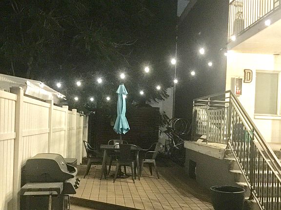 Step into a relaxing, intimate FENCED COURTYARD, complete with seating areas, an outdoor dining spot, softly illuminated in the evening with outdoor string lights.