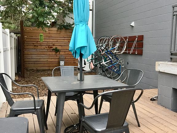 Stylish accent wallsVintage-chic vibeFenced courtyardOutdoor dining spotStainless steel wall storageFanimation ceiling fanFrigidaire gas range