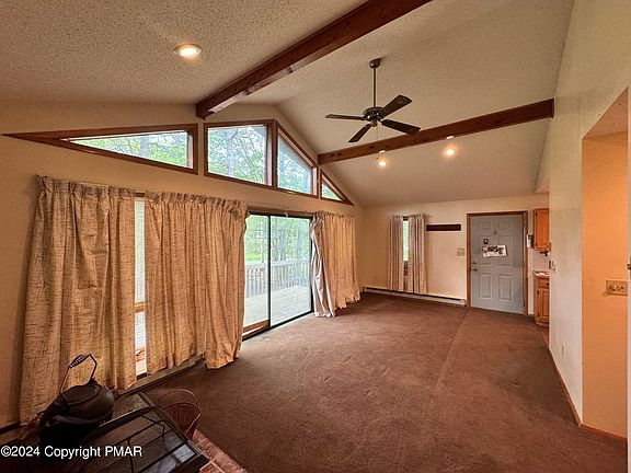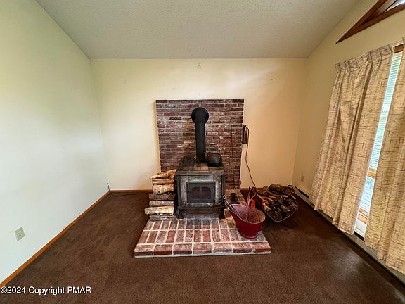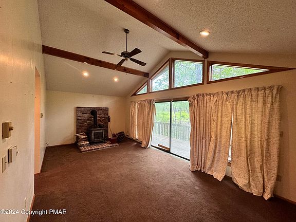 Enjoy your own Tranquil Home !! This lovely open floor plan , with a rooming living /dining area and wood stove open to kitchen with oak cabinets. With Cathedral Ceiling and ceiling fan and sliding glass doors that opens to the deck. # bedrooms with Hardwood Floors. Full Bathroom Full Attic for storage, Heated Basement , newer hot water heater,new well pump, one car garage, Brand new set of Stairs going into the house. There is a new Metal Roof Also A must See, In an Amenity Filled community Being SoLd AS Is Buyer to Reimburse seller for Propane at closing