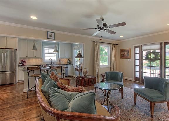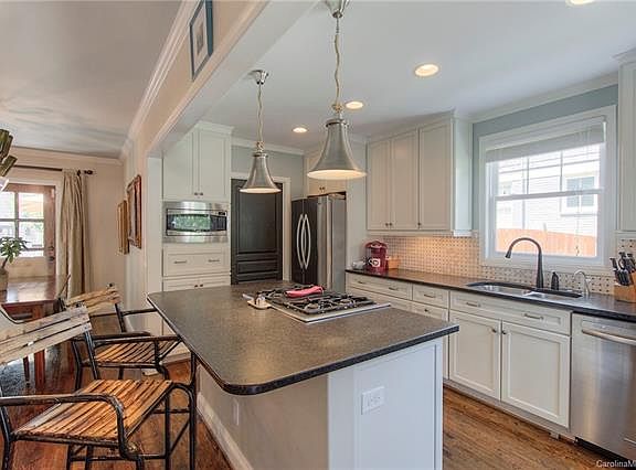 A Dilworth cozy charmer w/ master on main that's move-in ready! Sitting pretty on a quiet pedestrian-friendly street, it's easily walkable to booming SouthEnd. This 1940 bungalow was fully remodeled from the ground up in 2011 with continuous additions since. Fenced-in backyard is beautifully landscaped by renowned Myron Greer Professional Garden & Design including hardscape and full irrigation. Master Bath just updated. Powder bath just updated. New light fixtures on main floor & new kitchen quartz countertops. Open floor plan w/beautiful hardwoods throughout - no carpet! Large bonus room leads to small office w/ skyscraper view of Uptown - seen also from upstairs front bedroom. Entertain guests in the evenings on your outdoor slate/brick patio around the roaring fireplace. Oversized detached 2 car garage has 344 sq ft of unfinished full attic space offering future plans for a private office, art studio or exercise studio! Added parking bay out front.