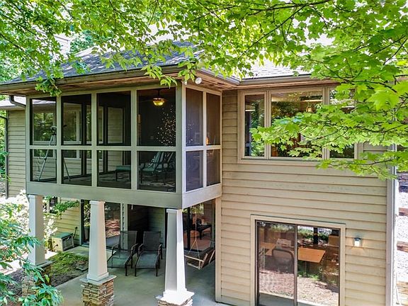 This lovely Keowee Key home enjoys lovely seasonal views of Lake Keowee during late fall through early spring! Since the current owner purchased this home over seven years ago, she has made this home beautiful inside and out. First, to enhance her views of Lake Keowee, she has removed approximately 50 trees, added stone to the exterior, replaced the original wood front porch with stone porch and stairs and tapered columns at the front door and removed the original retaining wall constructed with railroad ties. The new retaining wall is faced with stacked stone which carries around the back of the house where the exterior patio is. Naturally, repainting the interior was a priority as well as removing wallpaper. The spacious kitchen faces Lake Keowee and has brand new appliances that are just weeks old at this time. The fireplace was refaced with stacked stone as well to give the home an updated and cozy feeling. The lower level originally had a huge rec room. It still does, but a wall was added and an additional bedroom created for visitors. There is a workshop and a full bath to complete the space on the terrace level, which enjoys the seasonal views of lake Keowee with the exception of the workshop. The tapered columns also grace the exterior of the home.