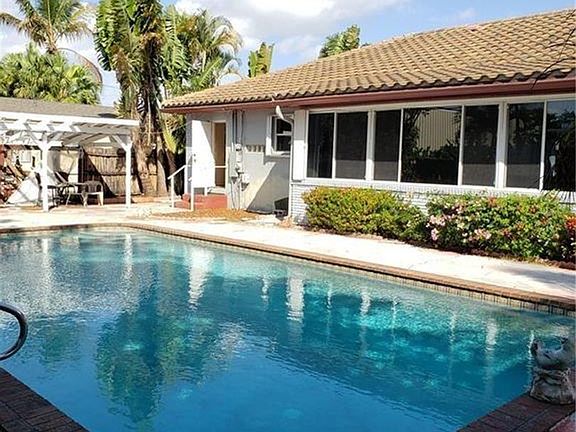 Spacious 3-bedroom, 2-bath pool home located just one block from Wilton Drive's shops, restaurants, and nightlife. This home features hardwood floors, vaulted wood-beam ceilings, and a bright Florida room overlooking the private backyard and pool. The large kitchen offers plenty of cabinets and counter space, plus a laundry room with washer and dryer. Primary suite includes a cedar closet, and there's an additional bonus room for storage, office, or fitness. Outdoor highlights include a big pool, outdoor shower, and generous entertaining space. Pool and lawn service included; tenant responsible for utilities. Pets considered.
