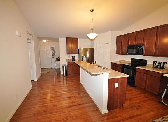 Move in condition great room ranch style home with the popular open floor plan, vaulted ceilings, and gorgeous wood floors in great room, dining room, and kitchen. Open kitchen area with 42 inch cabinets, pantry, center island with breakfast bar, stove, microwave, disposal and dishwasher to stay!! Main floor laundry!! Master bedroom suite with walk in closet and master bathroom with double basin sink. Nicely sized 2nd and 3rd bedrooms. Neat and clean hall bathroom. Sliding glass door off great room walking out to a fantastic deck space overlooking your rear level yard and patio space. 2 car garage, and walk out lower level awaiting your finishing touch or perfect for storage.