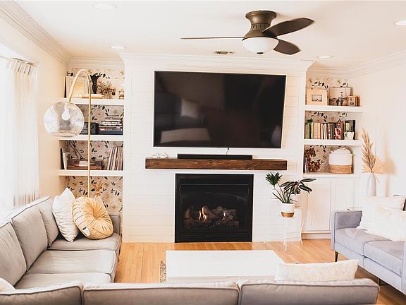 Enjoy the inviting front porch with a lovely view, perfect for relaxing with your morning coffee. Inside, the modern kitchen is a chef’s dream, boasting granite countertops, island seating, stainless steel appliances, a tile backsplash, and a pantry. The sunlit living room is highlighted by a stunning shiplap gas fireplace, creating a warm and inviting atmosphere.