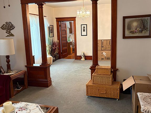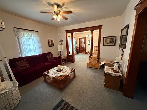 Charming 2 bedroom perfect for the 1st home! This well-maintained 2 bedroom home features beautiful colonnades and woodwork in great condition! This property is neat, clean, and move in ready. Enjoy the comfort of main floor laundry and a spacious full bathroom, plus an enclosed front and rear porch. Outside, the nicely fenced yard includes underground sprinklers and a detached garage. The property has a mix of vinyl and steel siding, and nearly all newer windows. This is a solid choice for first-time homebuyers or anyone looking for a cozy and manageable space!