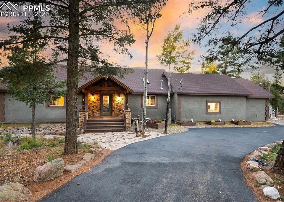 Discover your ultimate mountain retreat on 35 private acres just 15 minutes from Divide, CO. This expansive ranch home sits on a private road and is zoned A1, making it ideal for horses, toys, and outdoor adventures. Vaulted log beam ceilings, oak hardwood floors, and a cozy fireplace anchor the beautifully appointed main living area. The light-filled, open-concept design seamlessly connects the living, dining, and kitchen areas, while a wall of windows and a large west-facing deck attached to the primary suite provide sweeping mountain views and unforgettable sunsets. The gourmet kitchen features granite countertops, wood cabinetry, a center island, pantry, and butler’s pantry, offering abundant storage and the perfect space for meal prep. The main-level primary suite boasts walk-out deck access, an adjoining bathroom, and a generous walk-in closet. Downstairs, custom banisters and river rock stairs lead to a spacious family room with a wood-burning stove that opens to a lower patio with a hot tub and a custom stone outdoor fireplace—perfect for entertaining. Three additional bedrooms, a full bath with double vanity and shower/tub combo, and a convenient laundry area round out the lower level. Outside, the property offers a mix of open pasture and forested land across the road, allowing for horses and plenty of recreational space. A fully functional chicken coop is one of several well-maintained outbuildings, adding charm and utility to this mountain homestead. There’s also a 100-yard shooting range, a greenhouse, trails for hiking or off-road exploration, a disc golf course, and a children’s playground area, making it a true outdoor enthusiast’s paradise. Ample vehicle and toy storage includes an attached oversized 2-car garage, two detached 2-car garages, and additional sheds. Secluded yet accessible, this mountain haven blends rustic charm with modern comforts.