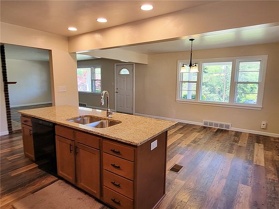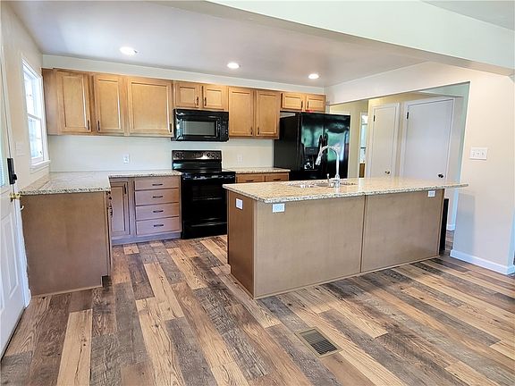 Beautifully Remodeled Home! Open floor plan with New Cabinets, New Granite Counter-tops and appliances, and recessed lighting. A huge kitchen island with extra seating is perfect for entertaining. Open Dining Room and Large Living Room, all with new floors and a decorative brick fireplace and wooden mantle. Two spacious Bedrooms on the first floor with new flooring and lighting fixtures. Updated Full bathroom, two linen closets for plenty of storage. Large basement with a bonus workshop area or perfect for extra storage space. Large 2 Car detached garage! Additional storage shed behind the garage. Backyard fire pit makes a great place to relax in the evening. All of this on half an acre!