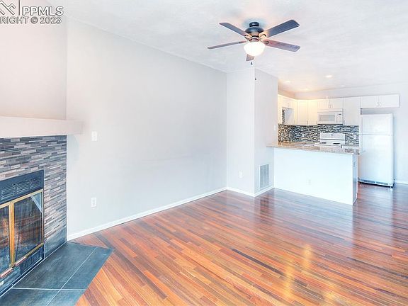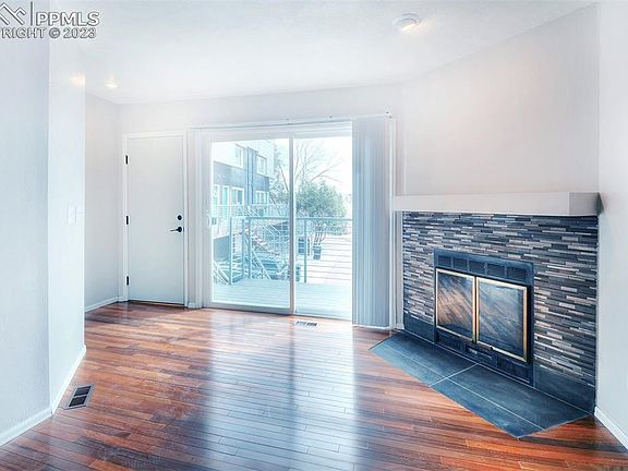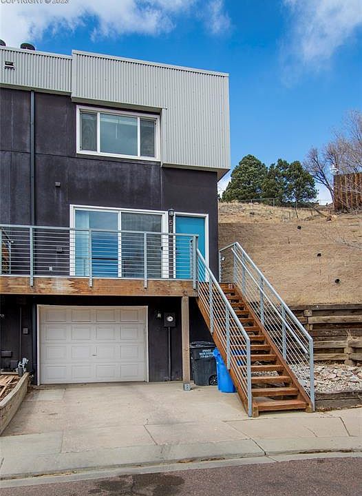Fantastic two story townhouse in the desirable Panorama Estates located on the west side of Colorado Springs. This end unit town home includes an over sized one car garage, a large front balcony and plenty of guest parking. Upon entry you are greeted with warm hardwood floors, an expansive living room with a wood burning fireplace and a powder bathroom. The kitchen offers granite counters, a breakfast bar and tile back splash. The upstairs has two bedrooms to include the master that has two closets and an adjoining bath. The other bedroom has mountain views off the back is located just steps from the full bathroom. The basement includes a mudroom with a washer and dryer and is conveniently located just steps from the garage door. Don't miss this opportunity to own a great townhouse in a one of a kind location!