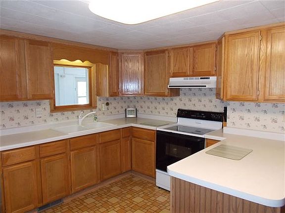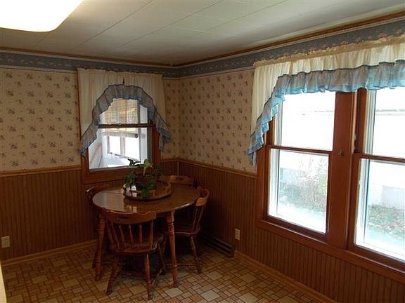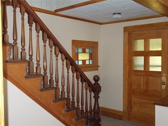 Great Starter home with plenty of room. Formal Dining Room, Open Staircase, Crown Molding, Stain Glass Window, Heated front enclosed porch. Newer furnace, roof, large two car garage, plenty of cupboards in kitchen, Fenced in yard, large deck, enclosed front porch. Possible hardwood floors under living and dining rooms. Bring your finishing touches