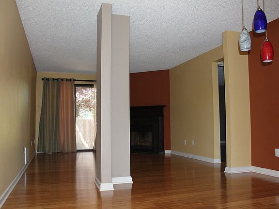 So much to offer! Finally a 1 level unit and on end! It also has a detached garage w/opener, AND a carport in front of unit. Windows and slider replaced! Tile roof! Enjoy fall and winter curled up by woodburning fireplace and be able to walk out of living room slider to patio/lawn area. Patio covered w/storage. Bamboo flooring throughout!! Fresh paint, tiled bathroom! Stainless appliances. Washer/dryer, refrigerator and window unit a/c included! Zonal cadet heating. Convenient location! MINT!