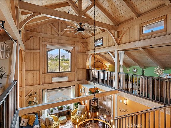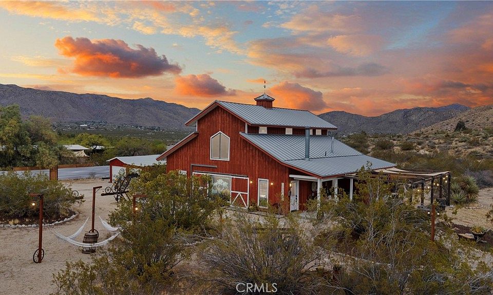 PRICED TO SELL, BELOW APPRAISED VALUE! Welcome to your high-desert sanctuary in Morongo Valley—an expansive 10-acre compound featuring two distinct homes surrounded by breathtaking mountain vistas and wide-open skies. Perfect for multi-family living, vacation rental, or personal escape, this property offers both vintage charm and modern comfort. The first home is a classic 50s desert gem, full of original character and warmth. With just over 1,300 sq feet, 2 bedrooms and 1 bath and its own garage. This single-story home captures the spirit of early desert living with cozy interiors and sweeping views. The second home, with nearly 2,700 sq feet—is a newer constructed modern barn by post & beam artisans Timberpeg—and is a true showstopper. This thoughtfully designed two-story residence features 2 bedrooms, 2 full baths, and a spacious loft with 2 additional sleeping areas (can be easily made into 3 bedrooms by converting mudroom). The primary suite boasts French doors that open to a serene patio, plus has a private en-suite bath. The guest bedroom has private access to the second full bath, and upstairs, two more beautifully appointed sleeping lofts—one with a queen bed and one with two kings—offering flexible accommodations for your guests. The open-plan kitchen, dining and living areas are all located downstairs with Saltillo tiles throughout. This modern barn, sold fully furnished, has proven its appeal as a successful Airbnb property, consistently attracting visitors and earning recognition as a top 5% guest favorite—a testament to its thoughtful design, comfort, and unique desert setting. All while being on city water and having natural gas, a rare and cost-saving amenity. Outdoors, the magic continues, the property backs up to protected wilderness. Gather around the fire pit under star-streaked skies, unwind in the bubbling hot tub, or explore the wide-open desert landscape—all from the privacy of your own 10-acre slice of the Mojave. There is also a stand-alone garage, which could easily be converted into an office, artist or music studio. Whether you’re hosting friends, recharging in solitude, or looking to invest in an income property, this retreat is a rare find. Morongo Valley, with its higher elevation and cooler temps is gateway to the high desert, only a short drive to Joshua Tree, Pioneertown, and Palm Springs, yet worlds away from the noise—this retreat invites you to live with intention, style and space.