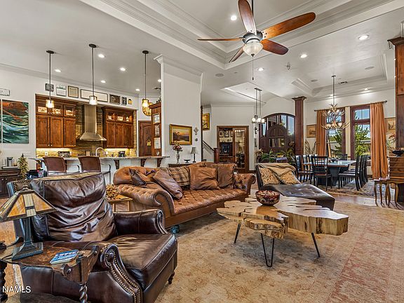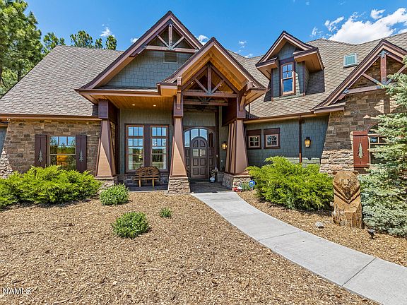 Magnificent mountain retreat offers a true haven for those seeking a move-in ready, custom home w/ almost 300K in upgrades, ADT smart home features perfect for staying in touch with the home when away, privacy & backs the National Forest. Timeless elegance is found throughout the main home boasting 4772 sq feet & 4 bed/3.5 bath. The open concept floor plan in the main house, designer touches, vaulted ceilings & custom woodwork, views, & outdoor spaces are sure to impress. Kitchen includes granite counters, two sinks, 5 burner gas stove top, gorgeous alder cabinets, & breakfast bar. Living room connects the dining room, kitchen & family room creating a wonderful entertaining space. The thoughtfully designed family room has a gorgeous stone fireplace & provides tranquil forest views through the surrounding windows creating a seamless transition between your indoor & outdoor spaces.The primary bedroom has a spa-like bathroom, w/two closets, double sinks, shower, jetted tub & direct access to the hot tub. Also on the main level: two guest rooms, Jack and Jill bathroom, office, laundry and guest half bath. The gorgeous staircase with custom tiles leads you upstairs to a fun teen/guest suite or movie room that features a microwave, granite countertop, small refrigerator and electric wall mounted fireplace, study nook, and large closet. Upstairs provides a wonderful bonus space, large cedar lined closet, sitting area with cozy electric wall mounted fireplace, and full bath. This quality built & well maintained 5 bedroom/4.5 bath estate includes a 1bed/1 bath 671 sq/ft guest house that sits above the detached RV garage. Guest house has a kitchen, living/ dining area, w/d, private entrance & private deck overlooking the forest. Host a backyard BBQ on the patio complete w/ covered built-in grill/mini kitchen & relax in one of the many sitting areas, hot tub or star gaze by the copper gas fire pit. The home sits on 2 fully fenced acres in a gated community just minutes from downtown Flagstaff. Back-up generator, flag pole, 3 car attached garage, 4 car detached RV garage + workshop and plenty of extra parking. Outdoor adventure awaits in the backyard or through the custom gate providing access to the National Forest directly behind the property.