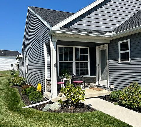Villa in Sylvania Township’s Quarry Ridge development. Built on a premium lot on a quiet cul-de-sac, this 1434-square-foot villa has a fabulous view of the pond. Built in 2020, the home is stunning and still feels like new! Upgraded gray quartz countertops, stainless steel appliances, and a huge great room that blends the kitchen, living, and dining spaces—everything you need on one level.