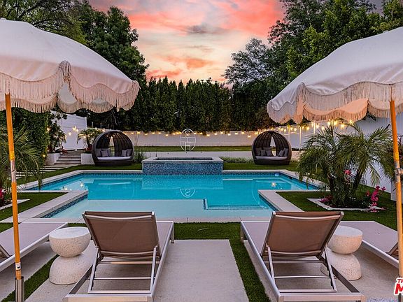 This property is available for short-term and long-term rentals, each with respective pricing options. It is fully furnished, decorated, and equipped with hotel-like essentials and amenities. With our concierge team available to assist 24/7, this home rental offers a five-star hospitality experience.Whether you're staying for a few days, a month, or an entire year.Experience refined California living in this newly constructed Modern Farmhouse, blending timeless elegance with cutting-edge design. Soaring ceilings, wide-plank European oak floors, designer lighting, and detailed crown molding create a seamless ambiance of sophistication throughout.A grand farmhouse-style entry door welcomes you into a sun-filled living room adorned with clerestory windows and a stunning stone fireplace, effortlessly flowing into a formal dining area perfect for entertaining. Anchoring the heart of the home is a gourmet chef's kitchen, complete with waterfall stone countertops, a center island with prep sink, walk-in pantry, stainless steel Thermador appliances, a farm sink, and a charming breakfast nook.The elegant family room is the ultimate gathering space, featuring a custom built-in bar, linear stone fireplace, surround sound, temperature-controlled wine cellar, and expansive pocket sliding doors that open to an entertainer's dream backyard.Upstairs, the lavish primary retreat boasts cathedral ceilings, a private balcony, fireplace, and dual walk-in closets. The spa-like en-suite bath is your private sanctuary, featuring a soaking tub, dual vanities, a private water closet, and an oversized glass steam shower.Three additional upstairs bedrooms offer comfort and flexibility for family or guests, while the upper-level patio provides a tranquil escape.Step outside to enjoy year-round resort-style living: a sparkling pool and spa with waterfall, firepit, covered patio for al fresco dining, and a lush, manicured lawn.Additional high-end amenities include a fully integrated smart home system, pre-wired surround sound (indoor/outdoor), and a comprehensive security camera system. Situated south of Ventura Boulevard, this exceptional home offers easy access to premier dining, shopping, and top-rated schools.