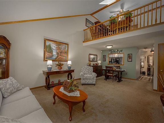 Stunning Quail Hill condo on a cul-de-sac! Every extra you've dreamed of can be found here! Covered front porch leads to an open foyer and kitchen with laminate wood floors, tile backsplash, granite counters, and black stainless steel appliances. The kitchen has a pass thru to the dining room and great room with a vaulted ceiling, crown molding, skylights, and a gas fireplace. Cheery sunroom has sliders that open to an inviting deck. First floor master suite with ceiling fan and walk in closet with access to a full bath with granite counters, Amish custom cabinetry, double sinks, and walk in shower with a new glass door. The second floor has a spacious loft area, large storage space, a full bath, and 2nd bedroom. Surprising finished lower level with LED and pendants lights, built in wet bar with stools, built in storage and an electric fireplace....great for entertaining! Impressive workshop area, Naturestone garage floor with custom garage built-ins, and attention to EVERY detail! This condo is for the most discerning buyer!