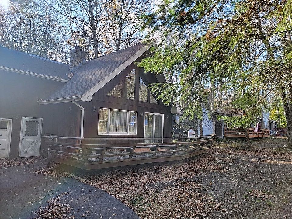 Great fixer Upper in the beautiful gated, amenity-filled community of Arrowhead Lake. The property is being sold in "as is" condition and is a great opportunity for either a primary residence, vacation retreat, or a vacation rental and is a popular get-a-way destination from Philadelphia, New York City, and New Jersey in the beautiful Pocono Mountains of Pennsylvania. This 3-bedroom, 2 full bath Chalet has an upstairs loft and a 400+ square foot bonus living room/ game room with fireplace over the 2 car garage and work-shop area. The property directly across the street from PA State Game lands and is 1 1/2 blocks from the lake front and beach area. The community is gated with security, 3 heated swimming pools, 2 lakes for fishing, swimming and boating. The community boasts many outdoor activities such as tennis, swimming, water aerobics, summer camps, bonfires, and more.