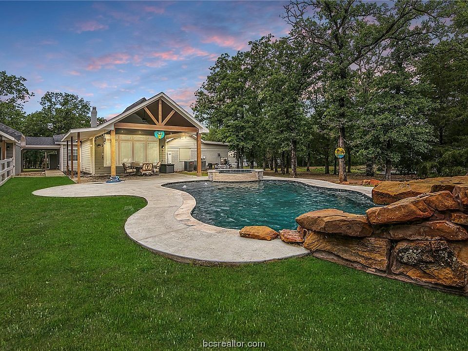 Secluded, densely-wooded 3.18-acre cul de sac lot zoned for College Station ISD with 3,210 sq.ft. updated home, stand-alone income-producing AirBNB casita, gorgeous luxury pool, 1,500 sq.ft. shop, fishing pond, and NO HOA! Outside city limits - NO CITY TAXES! Large 3,210 sq.ft. home with 3 bedrooms/3 bathrooms, and large living spaces, including a recently added family room with soaring ceilings, exposed beams, shiplap accents, bamboo wood floors, and it overlooks the covered patio and new luxury pool installed in 2022! Updated kitchen features gorgeous gray granite countertop, painted cabinets, and exposed "German Schmear" brick accents. Gas cooktop. Center island with eating bar. The primary suite is a delight, with a sitting room overlooking the fishing pond. All LED lights! New tankless water heater (2021)! Luxury pool installed by Sunshine Pools in 2022 features waterfall/grotto, 8-person hot tub, upgraded features. The 1 bed/1 bath stand-alone casita was completely remodeled - new minisplit AC. Shop (2021) has roll up door and private office with minisplit AC and half bath. Fishing pond has covered dock with space for seating. All LED lights! New aerobic septic system (2021). Zoned for Greens Prairie, Pecan Trails, Wellborn MS, and A&M Consolidated HS. Don't miss out on this amazing property! Schedule your showing today!