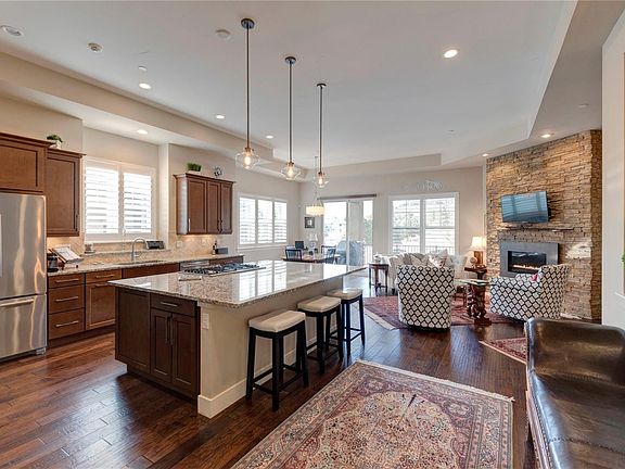 Total remodel in 2021-2022. Sunny & bright garden level with both lake & mountain views of the Mt Evans massif. Luxury finishes throughout includes dream chef's kitchen w/ stainless Bosch appliances (800 series refrigerator freezer with produce temperature-controlled drawer, double ovens, undercounter drawer microwave and second full built-in refrigerator/freezer w icemaker in basement bar, slab granite, wine double door bar refrigerator/wine cooler upstairs and a full bar in great room with additional full length Bosch refrigerator/freezer with icemaker, microwave. Large gymnasium with extra storage in basement. Two natural gas-log fireplaces in living and family rooms. Wide plank hardwoods throughout main level. Large master suite on main level and conforming 2nd upstairs bedroom, currently used as an office on main level floor adjacent to 3/4 bath. Serene mountain west-facing views from front porch, master bedroom & garden level back deck. Deck is covered, lit, powered and supplied with natural gas, and expanded back deck with access stairs to yard and lake. Luxury master bath with oversized shower, soaking tub, custom tile work & adjacent master closet with customized organizer. Large garden level basement features media room with a second gas-log fireplace and gaming/dining table area plus 2 spacious bedrooms, full bath, custom wet bar with microwave and full-length Bosch refrigerator/freezer with icemaker. Large gymnasium by downstairs great room. Plantation shutters throughout. Expanded private rear deck with stairs accessible to and overlooking lake and open space, with the Mt Evans massif as a backdrop. Cable & high-speed internet. Extra guest parking inside landscaped cul-de sac island. Steps from neighborhood fitness center, pool, trails, clubhouse, shops & restaurants. One of the finest member golf communities in Colorado. Gated neighborhood with manned security, and over 13 miles of trails. Within walking distance of two neighborhood pools and well-appointed & private neighborhood gym, shopping, services and fine dining.