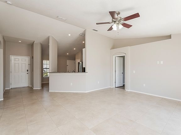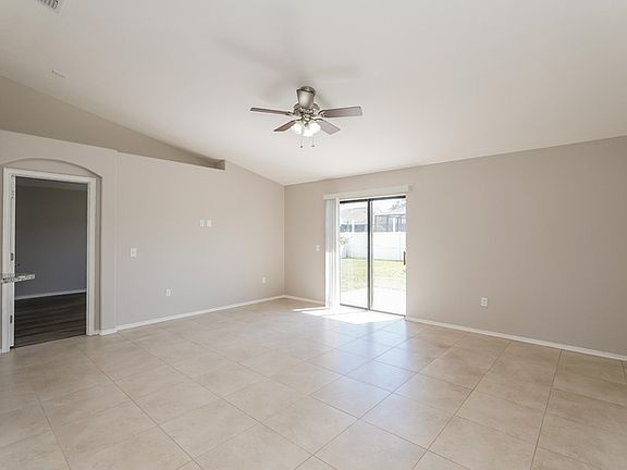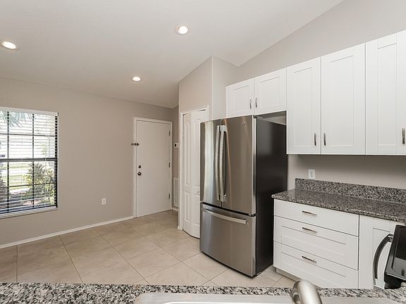 Step inside to find bright, open interiors enhanced by neutral tones and tile flooring throughout the main living spaces. The spacious living room flows seamlessly into the kitchen, where stainless steel appliances, granite countertops, and crisp white cabinetry bring both function and charm. A sliding glass door connects the interior to the backyard patio, perfect for outdoor dining or simply enjoying Lakeland's sunny days.