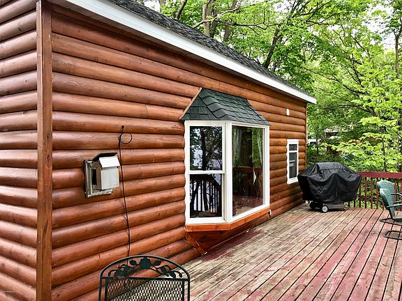 Completely renovated one-bedroom and two bath cabin on approximately 1/2 acre of lake shore property with East/West exposure and fantastic sunsets over the lake. This cabin boasts two large gas rock fireplaces located in the living room and master bedroom. Bathrooms are completely renovated with beautiful name-brand Jacuzzi tub in one bathroom and beautiful stand-up shower in the other. The kitchen has been completely renovated with stainless steel appliances and hook up for water at the refrigerator. There are two lofts. One loft is located off the living room that is accessed by a spiral staircase and can sleep six people comfortably with room for children to play. The second loft is located above the master bedroom with plenty of storage space and more room for small children to play.