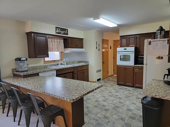 Check out this well-maintained ranch home located close to the schools, park, and Fitness Center. Main floor features an eat-in kitchen that opens up to a dining area and has ample cupboard and counter space! Good sized living room, full bathroom with lots of storage space, 1/2 bathroom, and 3 bedrooms all with good closet space all on the main floor! Two of the bedrooms have beautiful hardwood flooring. Full walk-out basement is partially finished with a large family room, smaller bedroom that would be perfect for an office space, roughed in 3/4 bathroom, laundry area, and large storage room. Attached 1 stall garage and a detached 2 stall garage! Detached garage is insulated with a heater that is all ready to be hooked up to natural gas. You will love this big backyard with alley access. Plenty of room for the kids/pets to play! Enjoy your evenings relaxing on the back deck. Established landscaping and trees. Newer boiler and on demand water heater. New washer and dryer and updated paint and light fixtures. This home is move in ready and waiting for you to start making memories in! All appliances to stay! Call today for your private viewing!