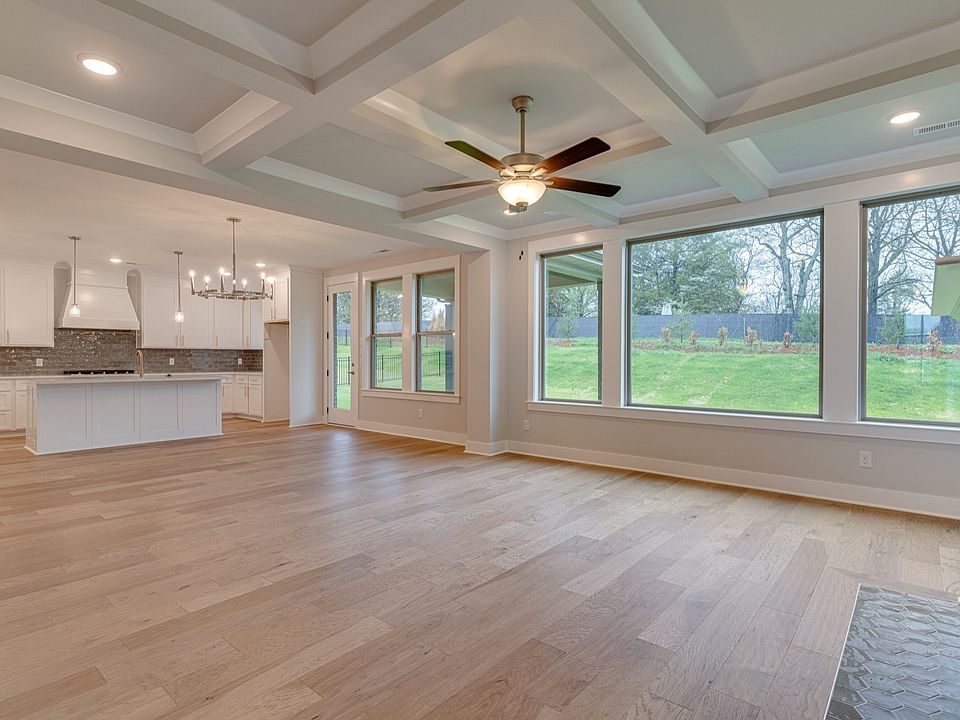 Phillips Builders | The Whitney Floor Plan - Primary suite on main level with dining/study versatility options. Open layout with large picture windows boasting a lot of natural light in the great room with stunning coffered ceiling. This home includes high end trim details throughout, a gourmet kitchen, quartz countertops, luxury owner suite/bathroom with three large bedrooms and bonus room upstairs.