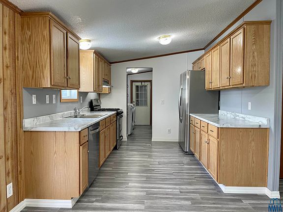 $25,000 price reduction! Completely remodeled home available now. This 3 bedroom, 3 bath home is located within walking distance to both Tyson plants and has received a complete makeover including flooring, paint, bathrooms and kitchen. The main floor plan includes a large open living/dining/kitchen space and an additional sunroom with sliders to the deck. The main bedroom includes its own brand new bath and has a walk-in closet. The other 2 bedrooms share a new bath and have walk-in closets as well. Between the kitchen and the garage is a main floor laundry room. Downstairs is a non-conforming bedroom or family room, 500 plus square feet of space that could be finished and a half bathroom. The furnace and air conditioning have been replaced and there are brand new shingles as well. The outdoor space has plenty of trees for shade out front and sunshine for your deck out back. The attached 2 car garage should accommodate most large vehicles and there is a huge driveway for anything that doesn't fit! This is a manufactured home on a permanent foundation/basement. Contact your lender for loan eligibility.