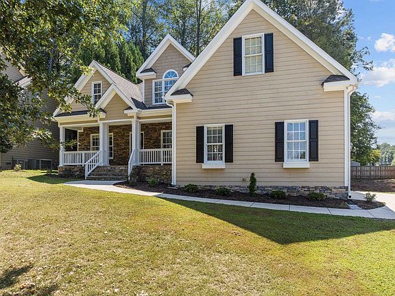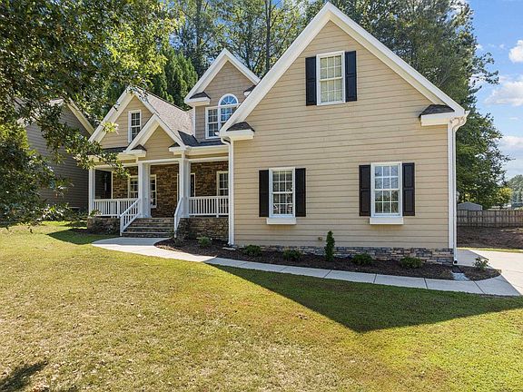 Welcome to your dream home! This stunning 4-bedroom, 3 bathroom residence is nestled on a cleared landscaped lot on nearly half an acre. Conveniently located near downtown Wake Forest, Joyner park, Wake Prep Academy and just 30 minutes to RDU. As you approach, you'll be greeted by an inviting front covered porch, a charming spot to enjoy your morning coffee. Step inside, and you'll be captivated by the grandeur of a two-story family room featuring a beautiful stone gas log fireplace, filling the space with both light and cozy warmth. The formal dining room is perfect for special occasions and a well-appointed office that can be used as a 5th bedroom. The primary bedroom, located on the main level, offers a private retreat with a luxurious ensuite bathroom. Additionally, the main level features a dedicated laundry room, making daily chores a breeze. Upstairs, you'll find three generously sized bedrooms, a full bathroom, and 2 large storage rooms. Step outside onto the brand new two tiered deck, where you can relax, host gatherings, or take a stroll down the greenway that conveniently begins behind the home