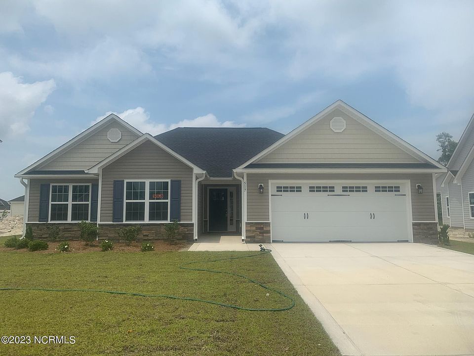 Welcome to the highly desired & popular community of Onslow Bay. Brand new construction built by Onslow County's most trusted & preferred builder, featured in Builder 100/ Top 200 Builders in the country. Onslow Bay is a hot spot, 3 miles to MCB Camp Lejeune's Piney Green gate, 14 miles to New River Air Station & minutes to area schools, shopping & dining. This beautiful neighborhood is sure to impress, complete with a clubhouse area & community pool. The Vienna 1583, 3 bedrooms & 2 bath with approx. 1583 heated square feet. The quaint but spacious foyer welcomes you into the huge 14x13 living room that is open to the kitchen. The living room features a ceiling fan and a fireplace with a custom mantel. The kitchen features staggered flat panel cabinets, a pantry, and stainless-steel appliances to include a smooth top range, dishwasher, and a built-in microwave. The grand master bedroom is approx. 12x 16 with a huge walk-in closet that is approx. 9x13. Master bath features dual vanity, separate shower and a soaker tub. Bedrooms 2 & 3 are on the opposite side of the house giving you plenty of privacy, both prewired for a ceiling fan. Out back is your open patio for all your entertaining or morning coffee. Call today! $10,000 USE AS YOU CHOOSE!!! NOTE: Floor plan renderings are similar and solely representational. Measurements, elevations, and specs may vary in final construction. Limited selections for buyer to choose. Call L/A to verify.