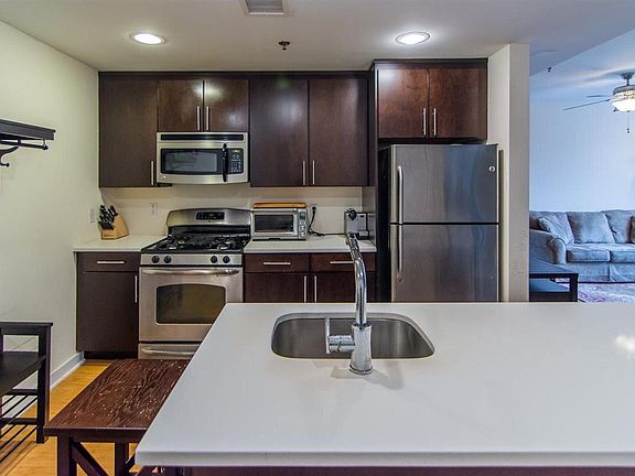 Emsee complex elevator boutique style building offers beautiful, sun filled 3BR (2BR plus den/2BA home - den has no closet) with 9' ceilings. Open kitchen with caesar stone counters, stainless steel appliances, bamboo hardwood floors. Primary bedroom easily fits a king sized bed and has a walk-in closet and primary bath with a dual vanity sinks. Second large bedroom filled with light has two wall closets. Third bedroom surrounded by windows easily fits twin bed and is perfect for a home office/nursery/roommate or guest room. Central AC & washer/dryer in home. Common landscaped yard. One garage parking space included. No Fee.