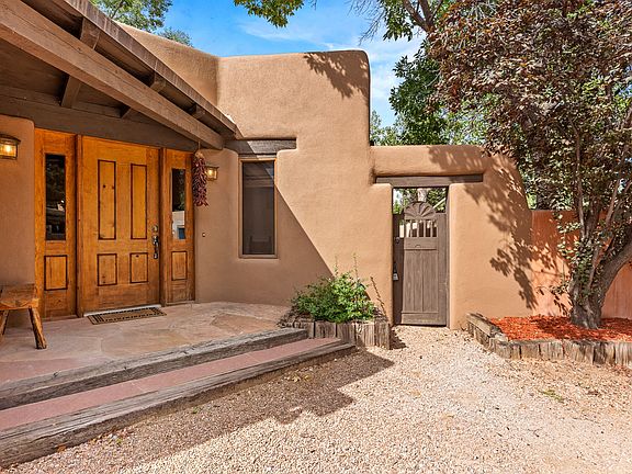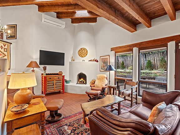Rare opportunity to claim your slice of historic Eastside magic on Santa Fe’s treasured Johnson Lane. The perfect pied-à-terre or a comfortable full-time residence, this beautifully cared for 3BD-2BA home (with two-car garage!) masterfully combines function with Southwest elegance. Finishes include brick and wood floors throughout, wood beams, and decorative tile work in numerous spaces. Down a modest flight of stairs, the living room offers high ceilings, bountiful natural light, and a wood-burning kiva fireplace. Outside, the fenced-in backyard offers shade from mature trees, low-fuss tiered garden beds (drip irrigation in-place), and an oversized flagstone patio for dining and outdoor leisure. The kitchen offers charm of its own—equipped with Fisher and Paykel appliances (2023), open shelving, and a custom Hopi mosaic backsplash behind the range installed by an indigenous artist. Upstairs, the primary suite is a retreat of its own with a cozy wood-burning fireplace and private outdoor balcony. Recently installed mini-splits throughout keep the home cool on hot summer days, and provide